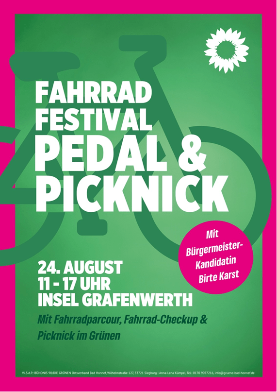 Fahrrad Festival Pedal & Picknick Fahrrad Festival Pedal & Picknickmit Fahrradparcour, Fahrrad-Checkup & Picknick im Grünen. Die Bad Honnefer Grünen laden herzlich ein zu einem fröhlichen und informativen Nachmittag rund ums Fahrrad. Bei unserem Fahrrad-Festival „Pedal & Picknick“ erwartet euch ein abwechslungsreiches Programm für Groß und Klein: Testet euer Können auf unserem Fahrradparcours Lasst euer Rad beim kostenlosen Fahrrad-Checkup fit machen Genießt gemeinsam ein entspanntes Picknick im Grünen Kommt vorbei, bringt Familie, Freunde und natürlich euer Fahrrad mit – wir freuen uns auf euch! Zeit: 24. August 2025 | 11 – 17 UhrOrt: Insel Grafenwerth Sonntag24.08.202511:00 - 17:00 UhrInsel GrafenwerthBad HonnefDownload als ics-Datei
